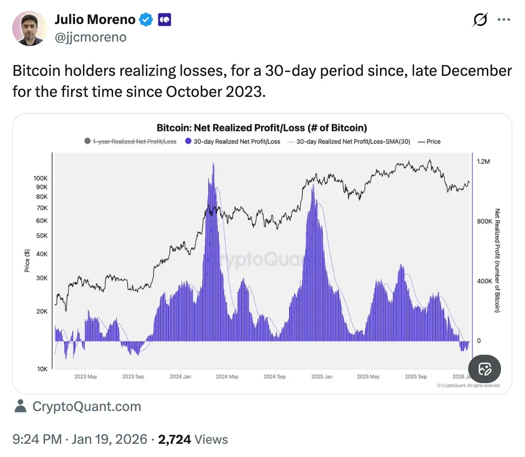 ​The current market movement comes as silver hit a record high of $94 per ounce, driven by geopolitical tensions such as the US-EU trade dispute over Greenland. Interestingly, on-chain data shared by Julio Moreno of CryptoQuant showed that Bitcoin holders are now realizing losses over the past 30 days for the first time since 2023. This signals short-term market stress.