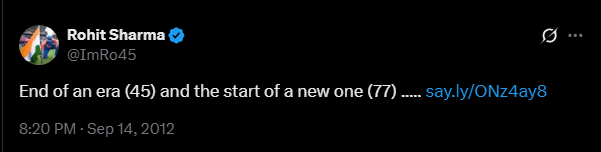 On September 14, 2012, Rohit Sharma took to his X handle (formerly Twitter) and wrote, ‘End of an era (45) and the start of a new one (77)’