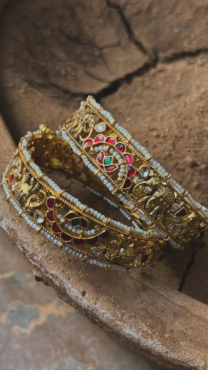 If you want to give a heavy looking bangle to your daughter, then get a kundan bangle studded with pearls with a gold border like this one. Which are heavy in appearance, but less gold is used in it.