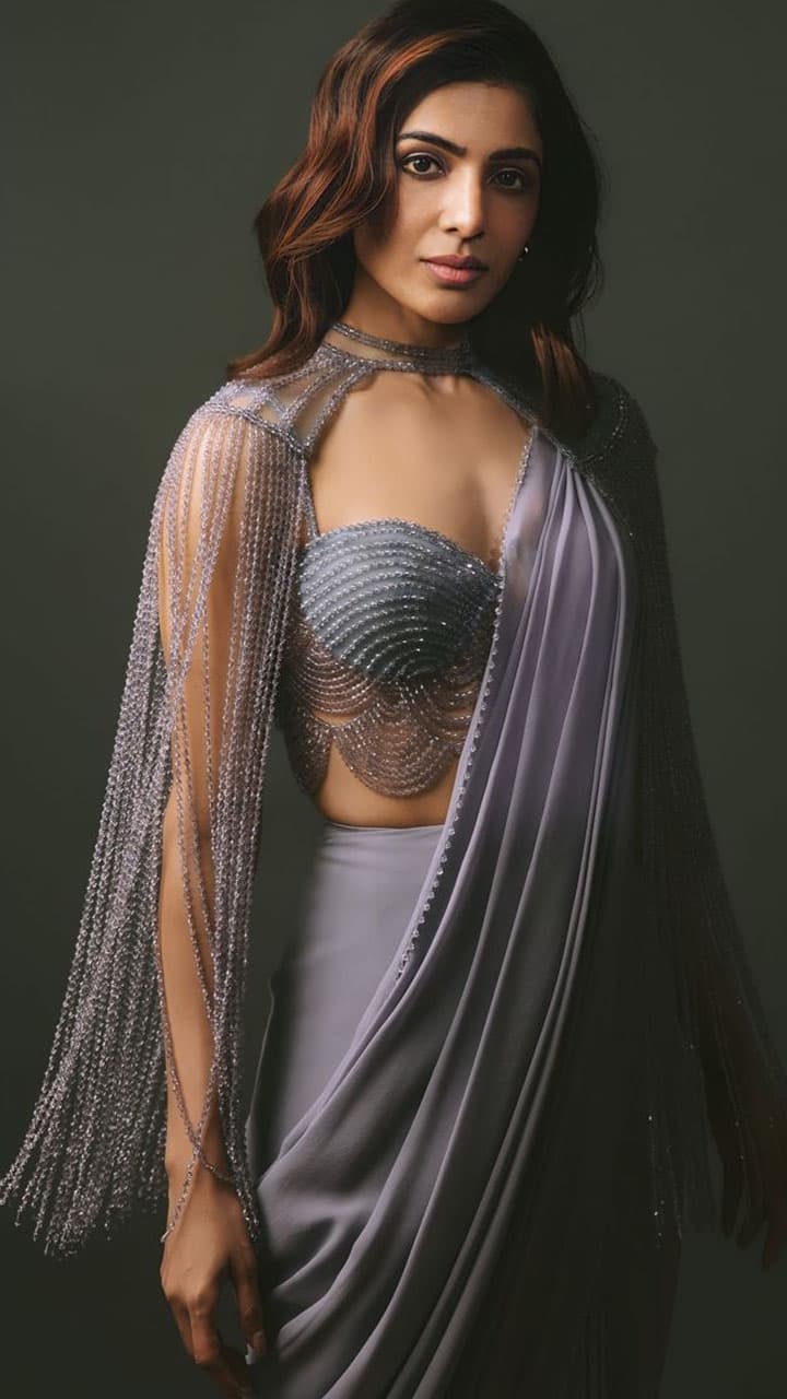 Samantha has been seen many times in a balloon-sleeve organza blouse, which gives an absolutely royal look. Perfect for home rituals or family photos. This blouse will make a simple saree rich.