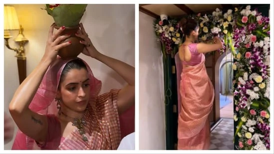 The photos shows multiple corners of her stunning home. It comes with views of the sea and lots of natural light. Sanya wore a pink saree as she took part in the rituals. She carried a kalash on her head under the guidance of the priest and her family.