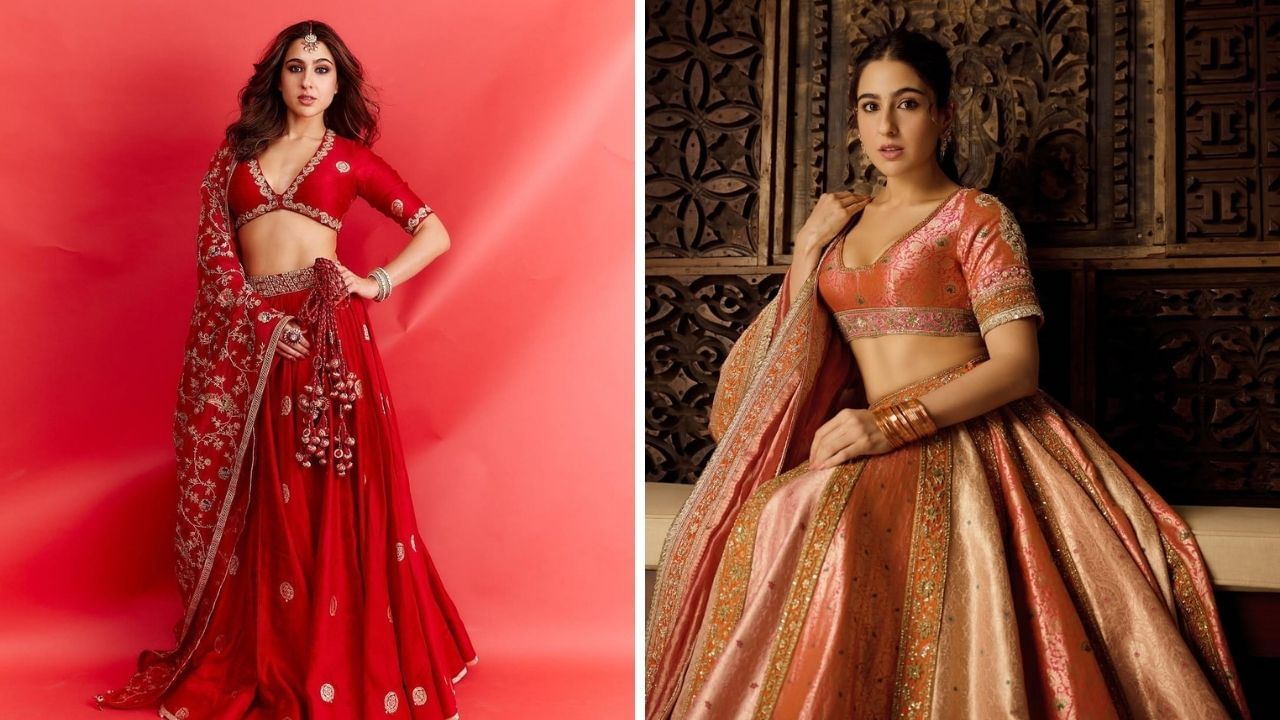 Sara Ali Khan is looking very beautiful in this lehenga look. She has worn a budded lehenga with peach, pink, cream color combination. Banarasi fabric has been used in her lehenga and embroidered lace work has been done from the buds to the belt. The actress has completed her look with halter neck blouse and matching dupatta. Orange bangles and flawless skin makeup are further enhancing her look.