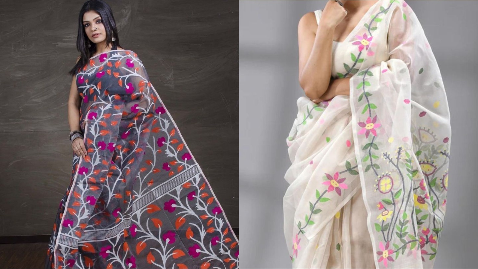 Kora Massalin and Jamdani saree are perfect options for party looks. It contains flowers and fine thread embroidery on geometric patterns with golden threads. You can get a royal look by wear it. Online-offline will get such a saree for 1000 rupees.