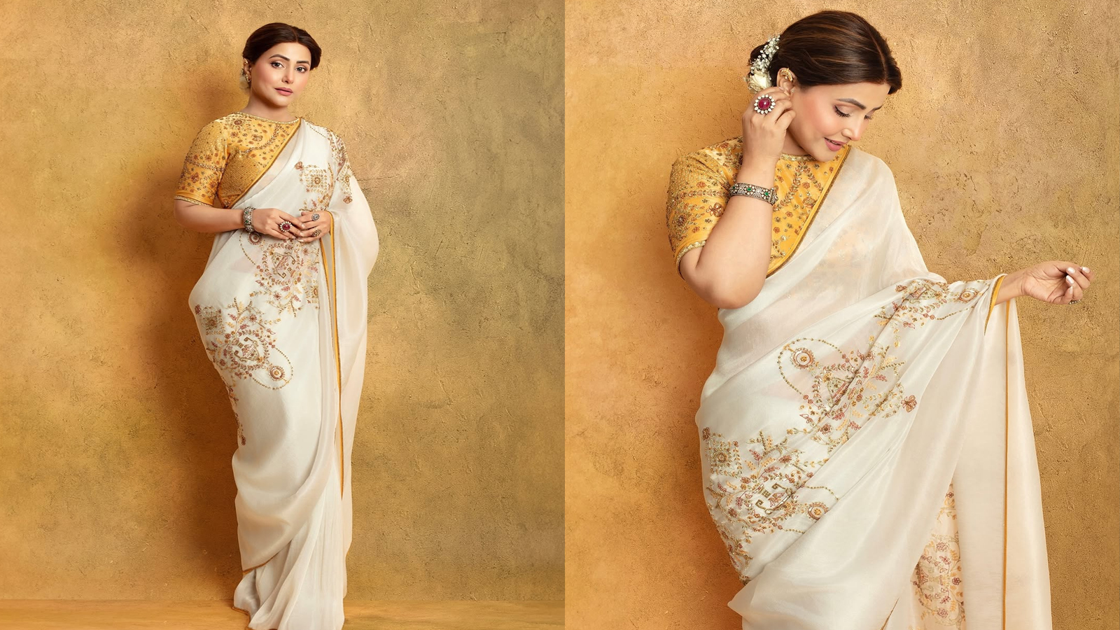Hina’s classic look in white embroidered saree