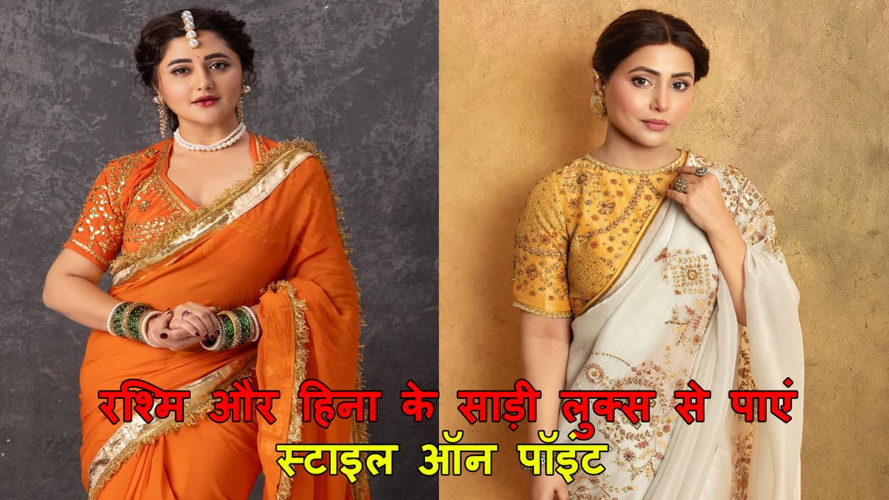 Hina Khan Vs Rashmi Desai Saree Fashion: Rashmi Desai and Hina Khan are great actresses. Both have been seen in many TV serials. Along with acting, her fashion is also very amazing, especially when she wears saree. Recently, both the actresses shared their picture in saree on Instagram, which is perfect for wedding functions. So let us show you 4 saree designs and blouse designs of both, from which you can also take inspiration.