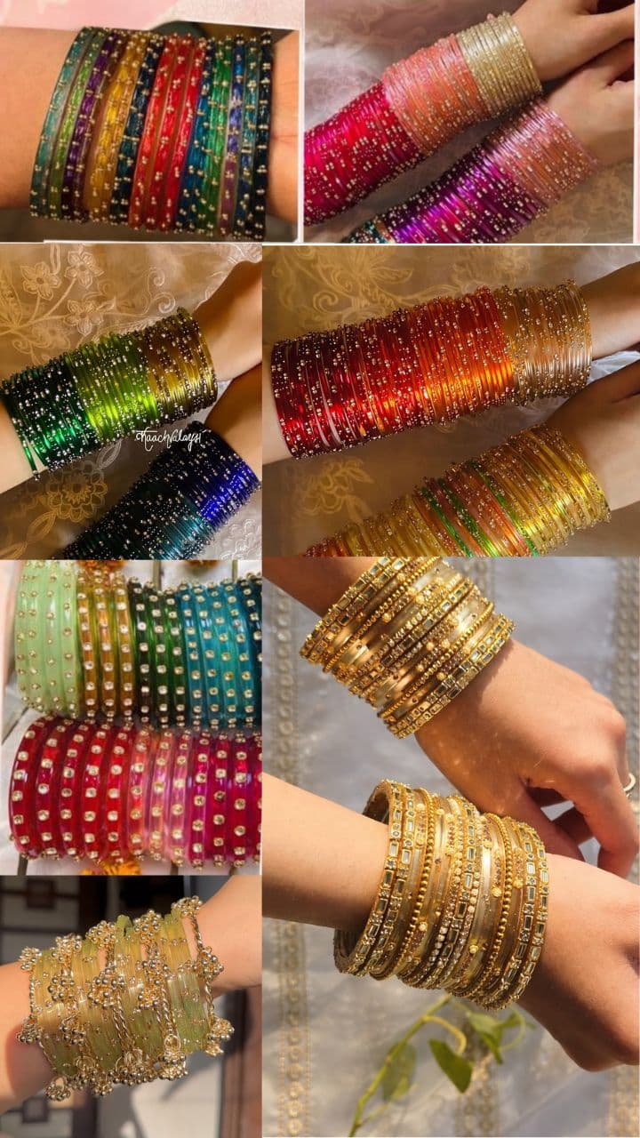 These mirror bangles with golden stone work are colorful and beautiful. These glass bangles are in trend in red, pink, green, blue and multicolored.