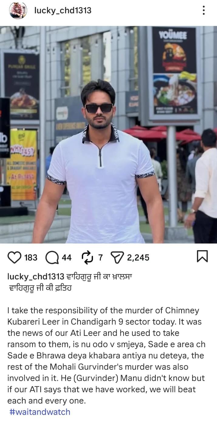 Hours after the killing, a social media post surfaced in which gangster Lucky Patial claimed responsibility for the attack. The post, written in Punjabi, suggested that the murder was part of an ongoing gang conflict. It also accused the victim of acting as an ‘informant’ against the group.