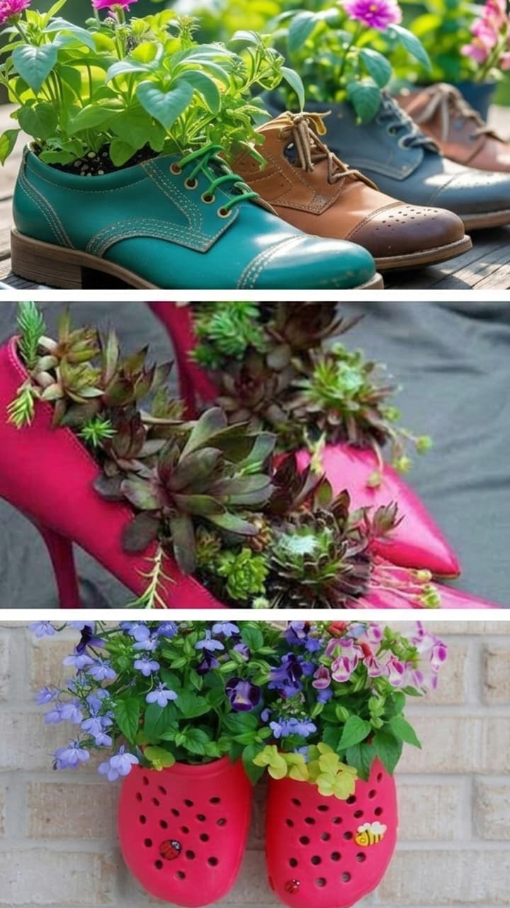 If you have an old shoe lying around, which is torn, then you can stick some buttons on it and put soil in the middle and make a shoe planter.