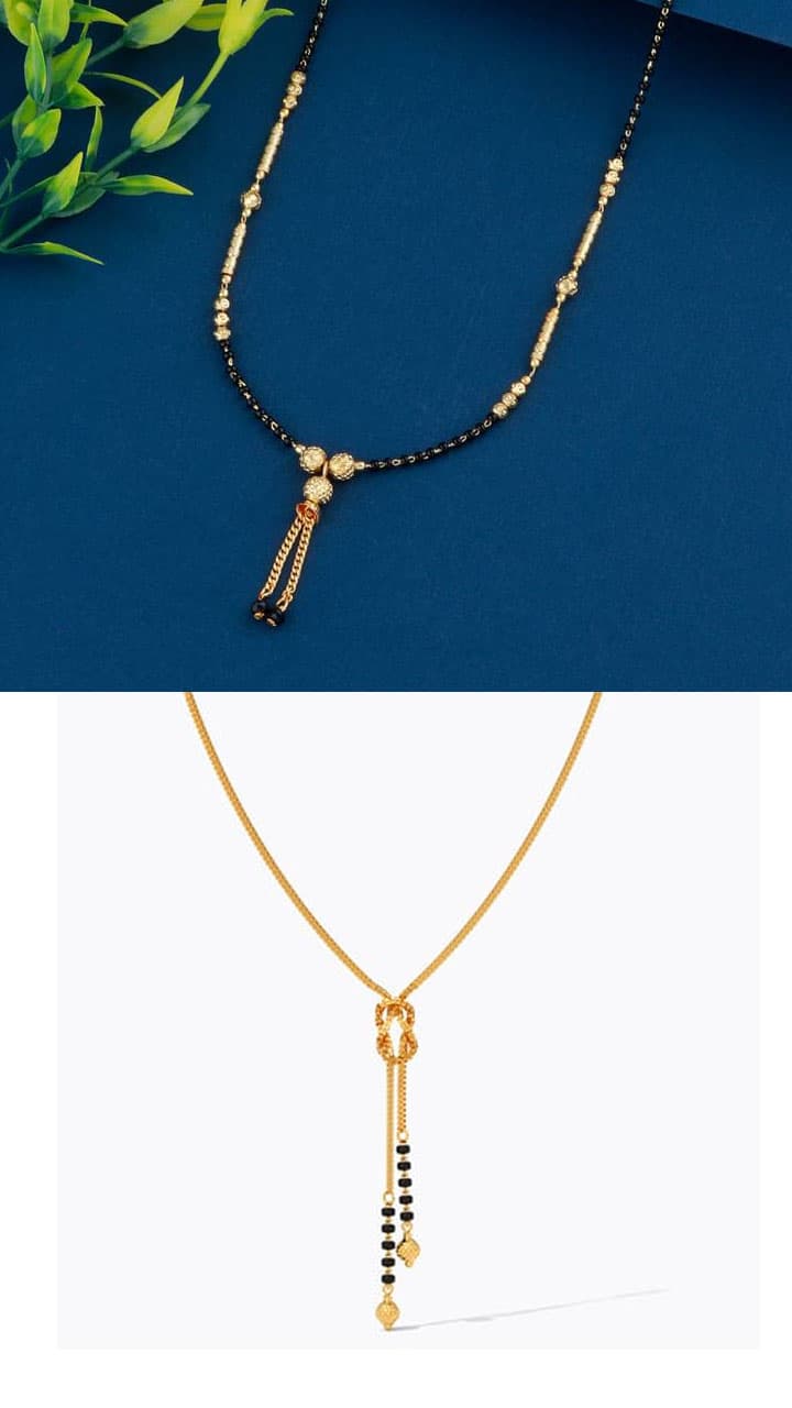 This design in 22KT gold mangalsutra is perfect for daily wear. You can get a small gold pendant design in thin black beads chain for about 4.8 grams for Rs 31,000 to Rs 33,000.