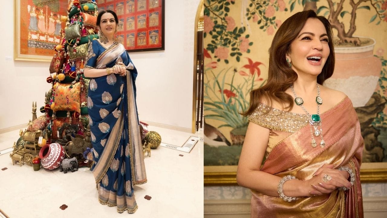 This look of Nita Ambani is a combination of tradition and modern style. She wore Manish Malhotra’s signature silver sequin saree, which has chevron pattern detailing, whose structure can be seen to be very complicated. Along with zari work, mirrors have been placed on the edges of the saree which are making the saree even more beautiful. To complete her look, Nita Ambani wore a matching miniature bag, drop earrings of Columbian Emerald and a beautiful bracelet of Emerald and Diamond which shows her high fashion choice.