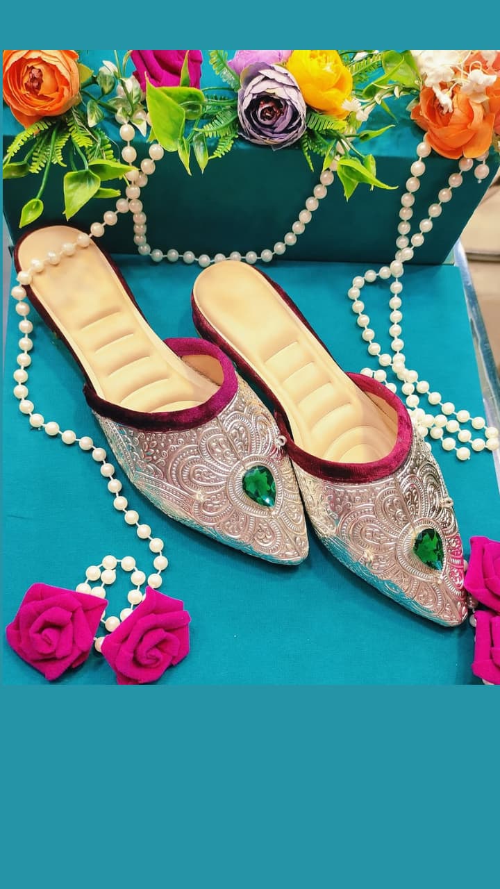 These silver slippers on red base, silver work and small beads work are very unique. Colorful stones along with pearls are used in it, which look trendy. You can also try this.