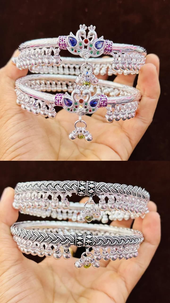 Fancy kada anklets with twisted rope silver and joint opening will give a regal look to the feet. It is built on floral motifs, colored stones, antiques and carvings. You can buy it for 6-8k.