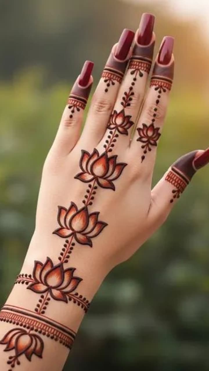 Try V shape lotus mehendi for a minimalistic look. It is made in bracelet style with a beautiful border, which comes with a lotus with long lines. This festival is best for small functions.