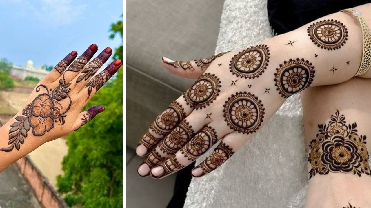 If we talk about light weight, quick looking and trendy mehendi design, then you can apply this design. This is kind of a last minute design. Make a simple flower with 5 petals and make small curves in it and then complete the design with bells, leaves and bigger curves. You can also apply this type of design on the back of the palm, which will look very nice.