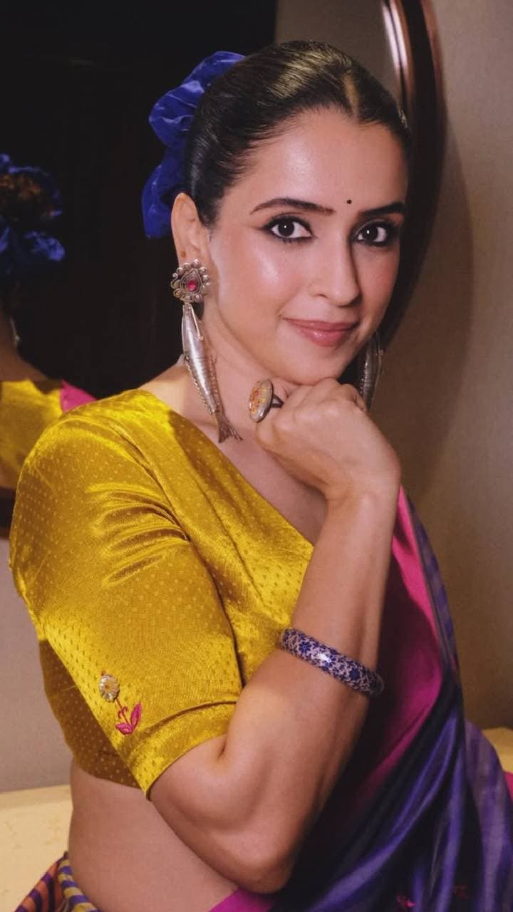 Sanya has paired a halter neck criss cross sequin blouse with a floral saree, which will make short height girls look beautiful in a cocktail party.