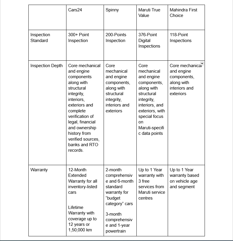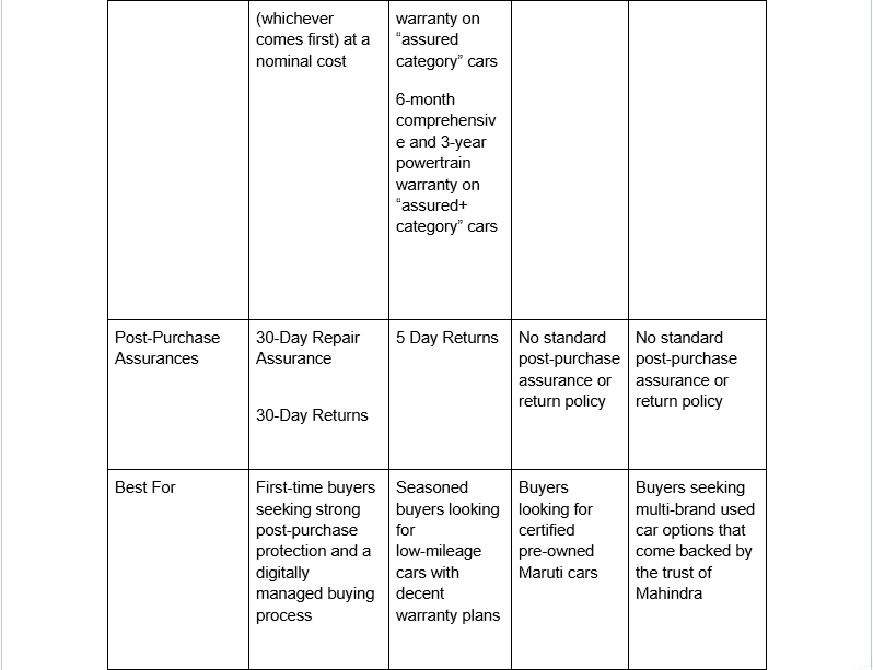 - Warranty Plans: The platform offers multiple warranty options for used cars, based on vehicle age and segment. The warranty plans range from 6 months to up to 1 year and cover core engine and transmission components only.