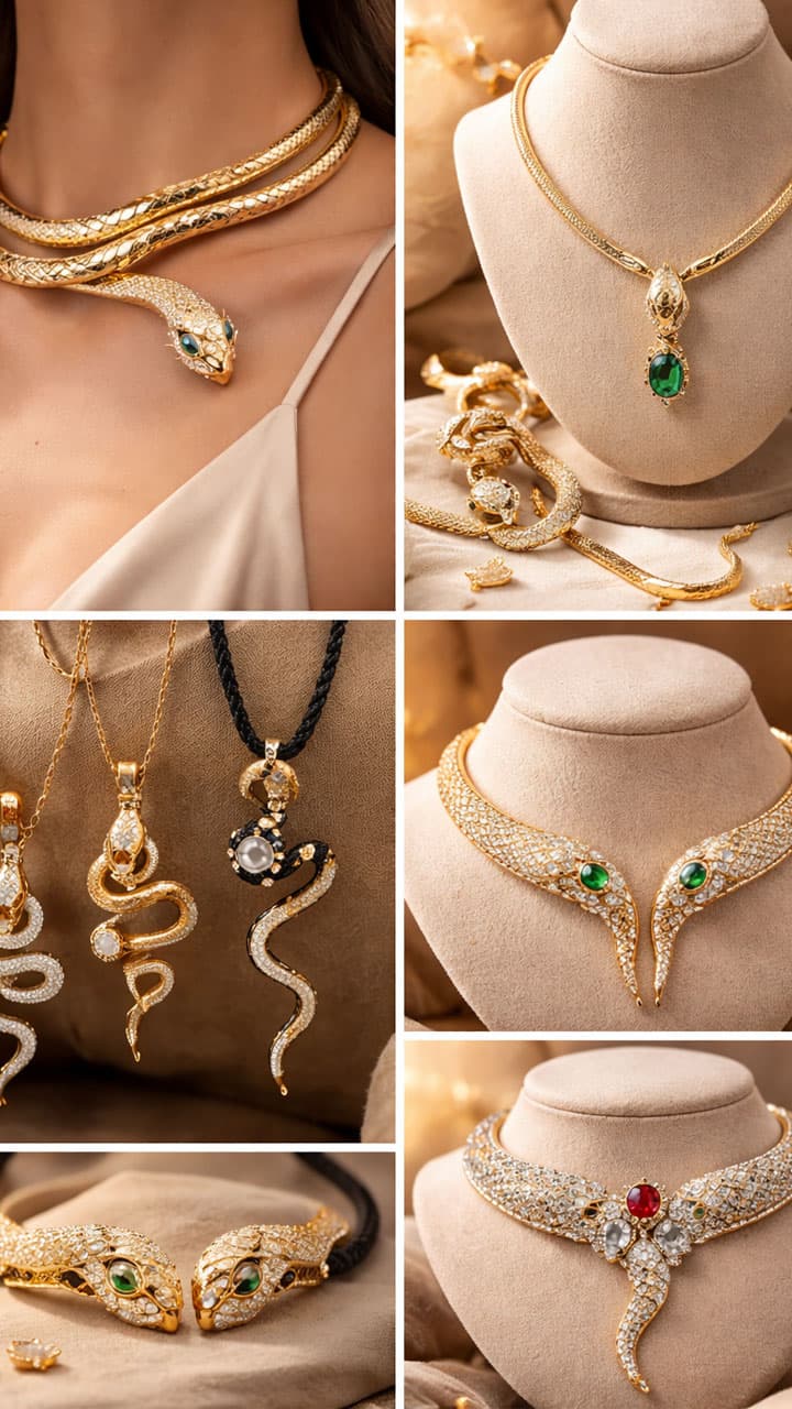 If you are looking for a heavy necklace, then you can choose a snake necklace with diamond detailing like this one. This will give a look like a choker set, in which stones are also decorated on the face of the snake.