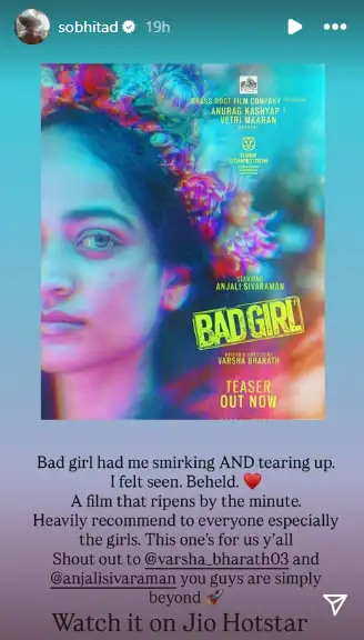 Sobhita shared the poster of Bad Girl on her Instagram stories and wrote that she feels seen after watching the film that made her tear up. She wrote, “Bad Girl had me smirking AND tearing up. I feel seen. Beheld. (heart emoji) A film that ripens by the minute. Heavily recommend to everyone especially the girls. This one’s for us y’all. Shout out to @varsha.bharath3 and @anjalisivaraman you guys are simply beyond (confetti emoji). Watch it on JioHotstar.” Varsha and Anjali reshared her review on their Instagram stories.