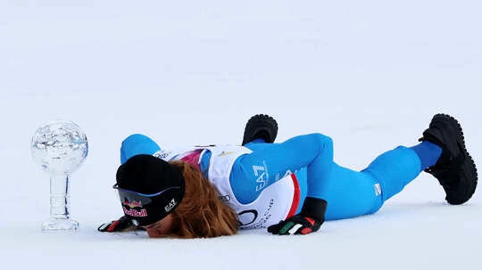 The Italian skier expressed her joy by placing the crystal globe on the ground and kissing the snow after completing her winning run.