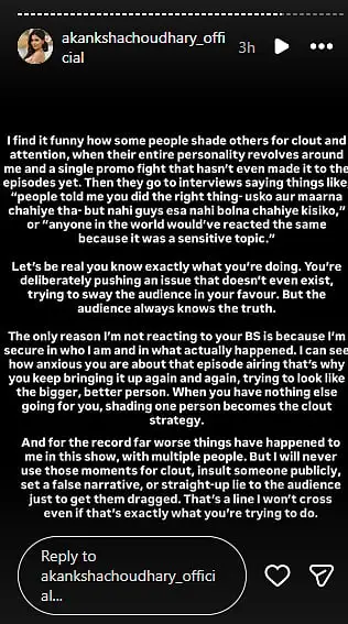 Akanksha further accused Diksha of pushing an issue that doesn’t even exist. From Akanksha’s statement, it appeared that the slapping incident might not have occurred exactly as it was portrayed. She also explained why she has not reacted to Diksha’s accusations so far, saying, “The only reason I’m not reacting to your BS is because I’m secure in who I am in what actually happened.” Akanksha went on to claim that Diksha was anxious about the episode airing and was trying to set a narrative beforehand, writing, “When you have nothing else going for you, shading one person becomes the clout strategy.”