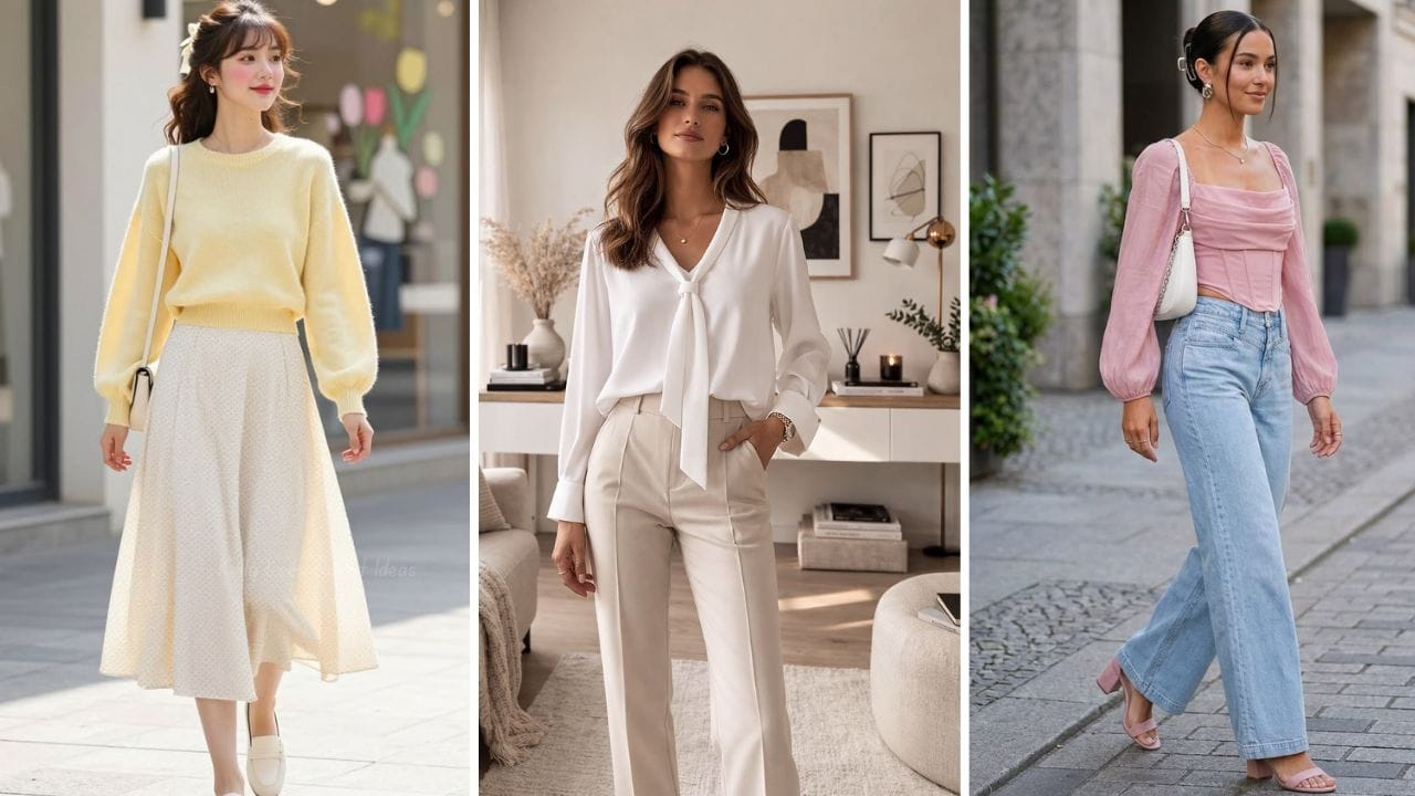 Well-fitted light-wash denim paired with a pastel blouse keeps the look playful yet neat. Layer with a lightweight jacket if needed.