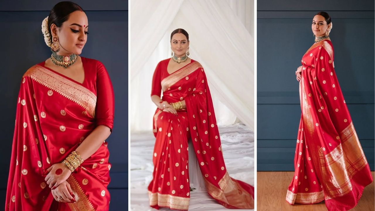 Sonakshi looks gorgeous in a rich red Banarasi saree featuring large golden motifs and a contrasting border. Her jewellery, a statement necklace and matching earrings, finishes the traditional festive look.