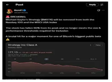 Strategy faces growing structural pressure as Bitcoin retreats and the MSCI review nears. The company’s index position depends on its market cap and business classification, not Bitcoin’s price. Investors may need to monitor the January 2026 review closely because it could reshape institutional flows and future liquidity.