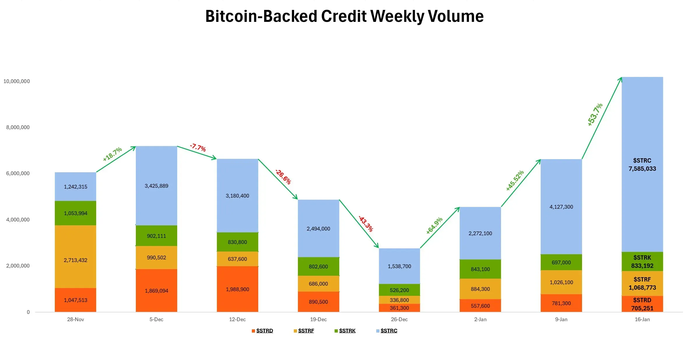 Weekly volume for Strategy’s preferred products jumped 53.7% week over week, as Strategy preferred stock Short Duration High Yield Credit (STRC) saw its highest volume week in mid-January.