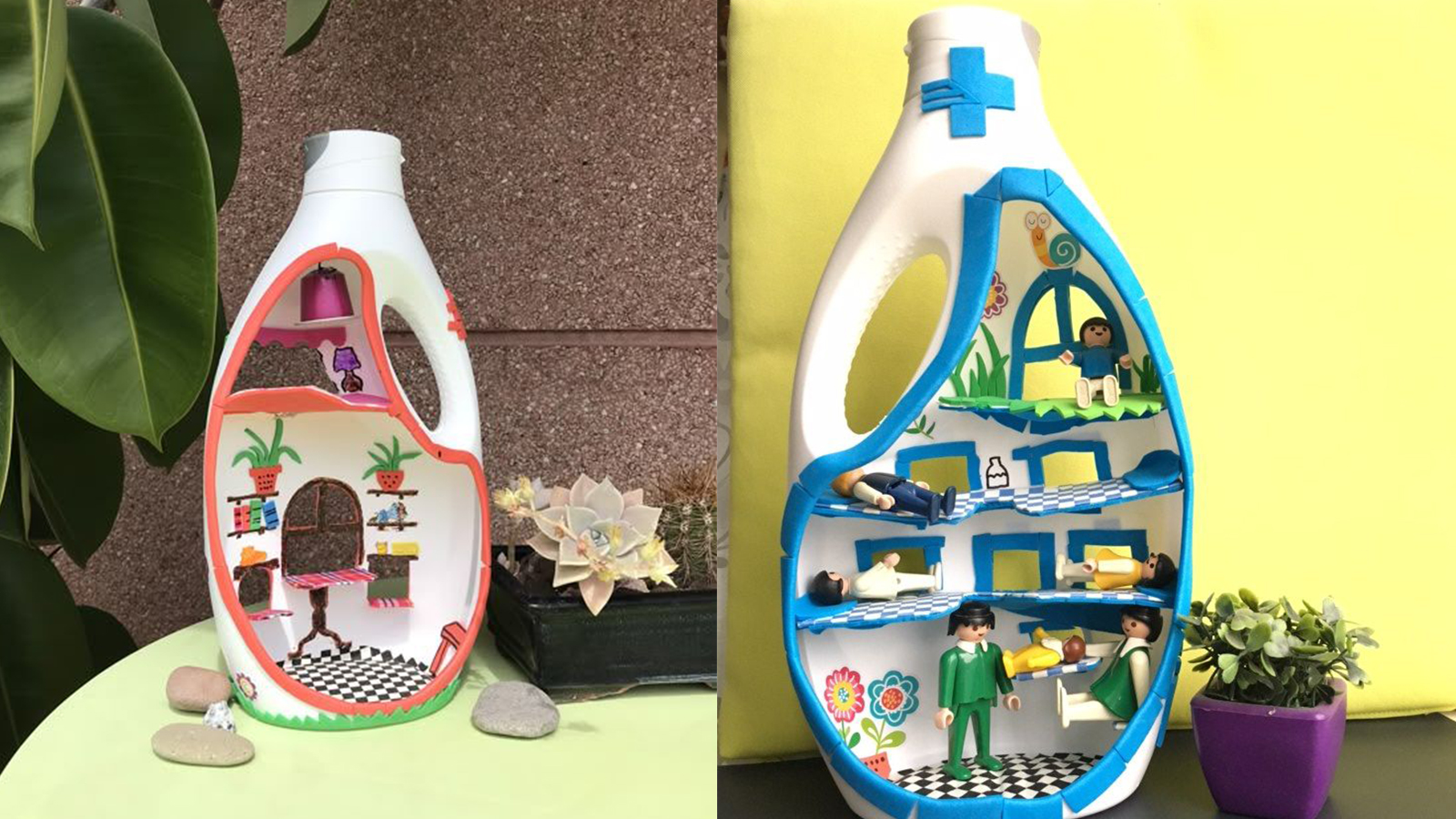 Cut an old large Surf Excel bottle down the middle and level it with sandpaper. In this, make a creative and small version of doll house or doctor room for children.