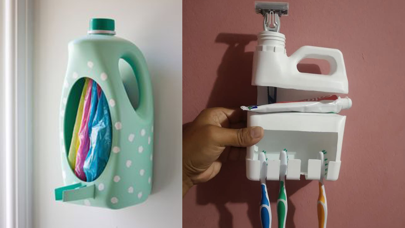 If you also buy expensive organizers from the market to keep toothbrushes or shaving kits in the bathroom, now you can make a mini organizer like this by cutting an old Surf Excel bottle and then keep everything from toothbrushes to sanitary pads and shaving kits in it.