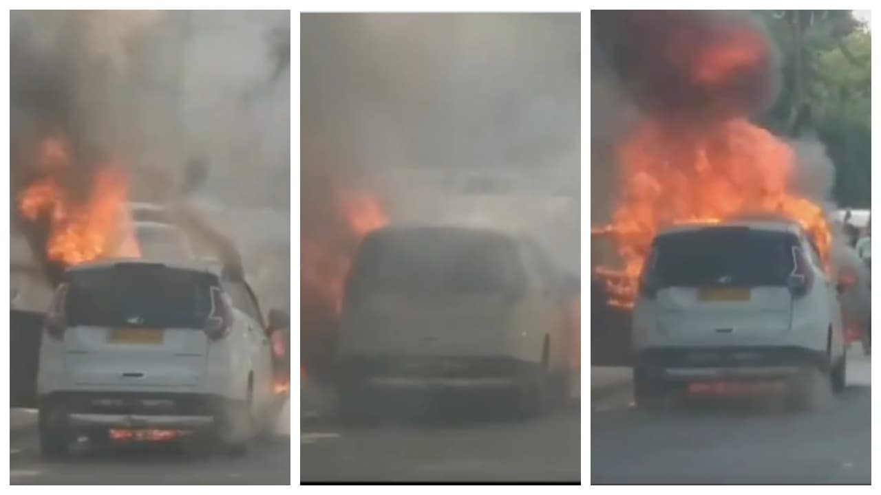 Suddenly flames started rising from the bonnet of the moving vehicle. After this, due to the presence of mind of the driver, the people in the vehicle escaped without any injuries. Due to this a major accident was averted. Although all the family members including the children and a woman in the car were saved safely, the car was completely burnt to ashes within a few moments.