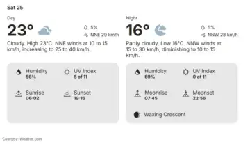 As per Accuweather, the temperatures would float around the 16 degrees to 23 degree-mark Celsius in what are still early days of the summer Down Under. The humidity is likely to be between 56-69 per cent. The wind will gradually pick up as the day progresses.
