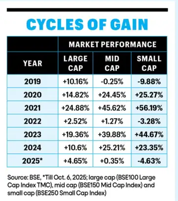 Cut to 2023, the large-cap index was up 20 per cent and the mid-cap index was twice that much with a 40 per cent gain. For any investor, the performance of their investments can change dramatically depending on the allocation made to each of these equity segments. For instance, if you had invested Rs 100 in a flexi-cap scheme, it would have internally divided this among Rs 40 allocated to mid-cap and the remaining Rs 60 equally between large- and small-cap as of January 1, 2025. Over the past 10 months, the value of the investment may appear to be static. However, if the same investment were divided 50-50 into large- and mid-cap stocks, the result would be an overall 2.5 per cent gain.