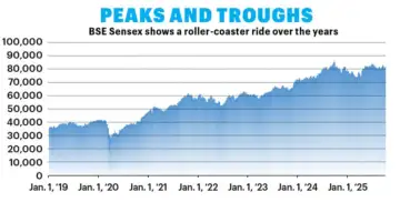 As much as you look back in history to draw out examples, it is a fact that uncertainty in markets makes investors jittery. Stock markets are volatile because nobody knows how policy changes or global events will affect a company’s ability to generate profits. A little over a year ago, on September 26, 2024, the BSE Sensex recorded its all-time high of 85,836.12 points. As expected, market optimists predicted that the Sensex could reach the 100,000 mark by the end of 2024.