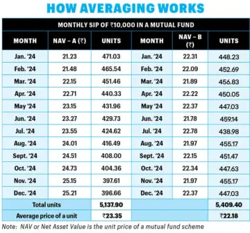 To understand the effect of averaging and its impact on containing volatility, let us consider a monthly SIP of Rs 10,000 in two different MF schemes, A and B (see How Averaging Works). Scheme A witnesses an upcycle, where the NAV of the fund for a period of 12 months is on the rise. Scheme B, in contrast, undergoes a volatile phase of fluctuations. It can be seen that the overall units acquired through Scheme B are higher than the number of units acquired by Scheme A. Importantly, the average cost of each unit is lower in the case of Scheme B compared to Scheme A. Investors must accept that market fluctuations are inevitable, and even the most experienced investors may struggle to predict market highs and lows accurately.