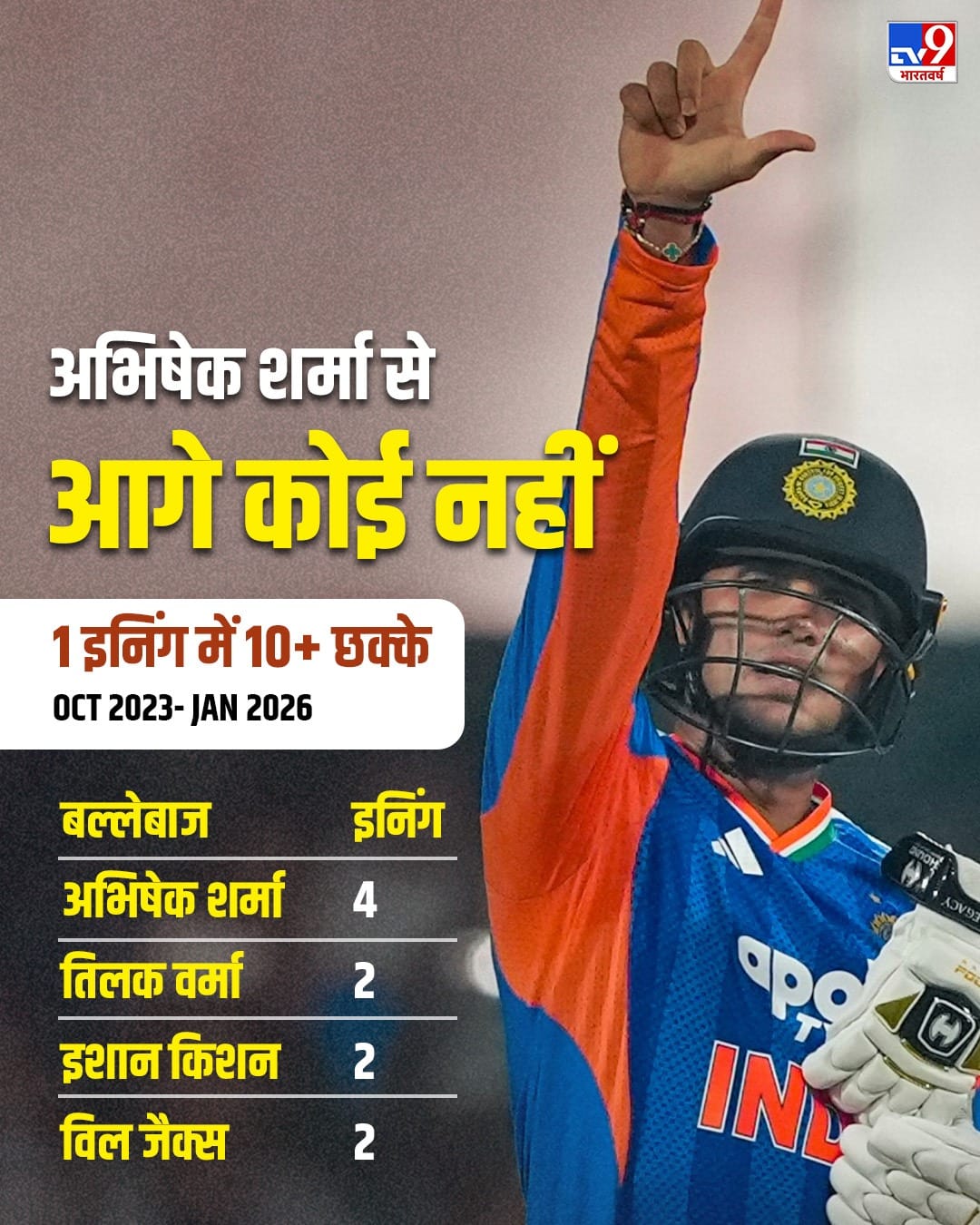 भारत के बल्लेबाजों ने 9 बार एक इनिंग में 10 या उससे ज्यादा छक्के लगाने का कारनामा अक्टूबर 2023 से जनवरी 2026 के बीच किया है. मगर उसमें से 4 बार वो काम अभिषेक शर्मा ने अकेले किया है. उनके अलावा तिलक वर्मा और इशान किशन ने 2-2 बार वैसा किया है.