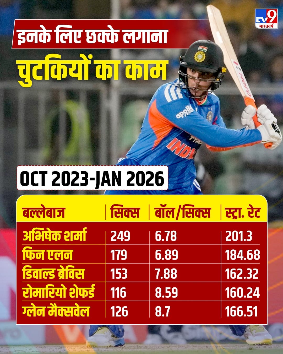 अभिषेक शर्मा को मॉर्डन क्रिकेट का नया सिक्सर किंग कहा जा रहा है. इसमें कुछ गलत भी नहीं है क्योंकि दुनिया के जिन बल्लेबाजों के लिए छक्के लगाने चुटकियों का खेल है, उनके बीच भी शर्मा जी के बेटे की गजब तूती बोलती दिख रही है. अभिषेक शर्मा ने अक्टूबर 2023 से जनवरी 2026 के बीच 201.3 की स्ट्राइक रेट से 249 छक्के लगाए हैं. यानी उन्होंने हरेक सिक्स को जमाने के लिए 6.78 गेंदें खेली हैं. अभिषेक का स्ट्राइक रेट सबसे ज्यादा और उनका बॉल पर सिक्स रेशियो किसी भी बल्लेबाज के मुकाबले सबसे कम है.