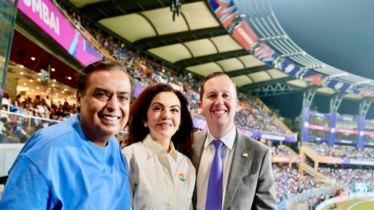 On X, Ambassador Gor wrote, “Great to see my friends Mukesh and Nita Ambani on the sidelines of the #T20WorldCup match between @USACricket and India.”
