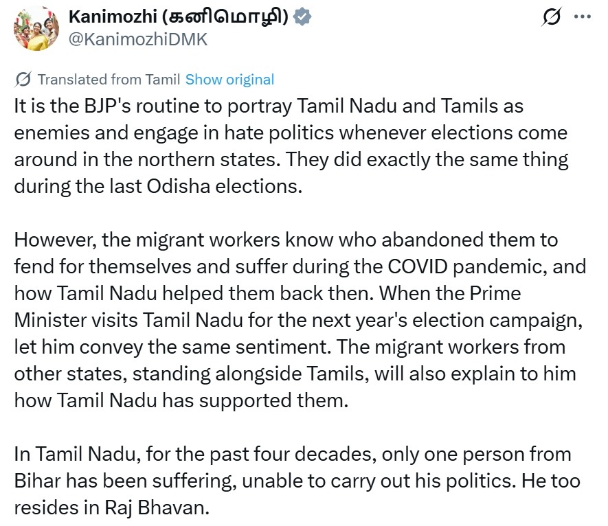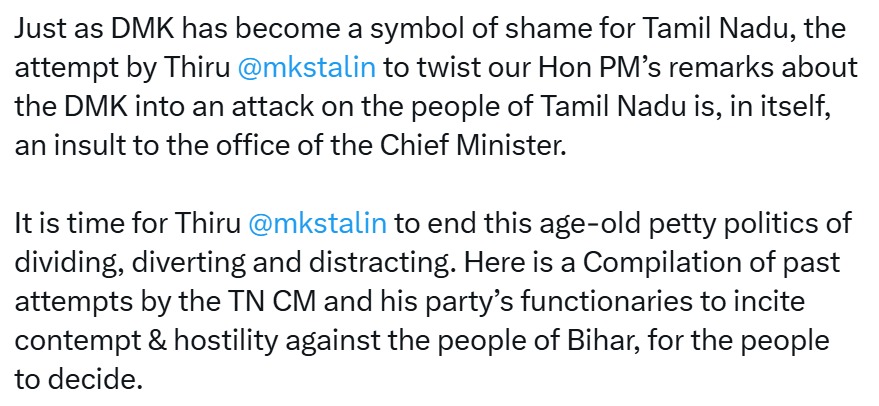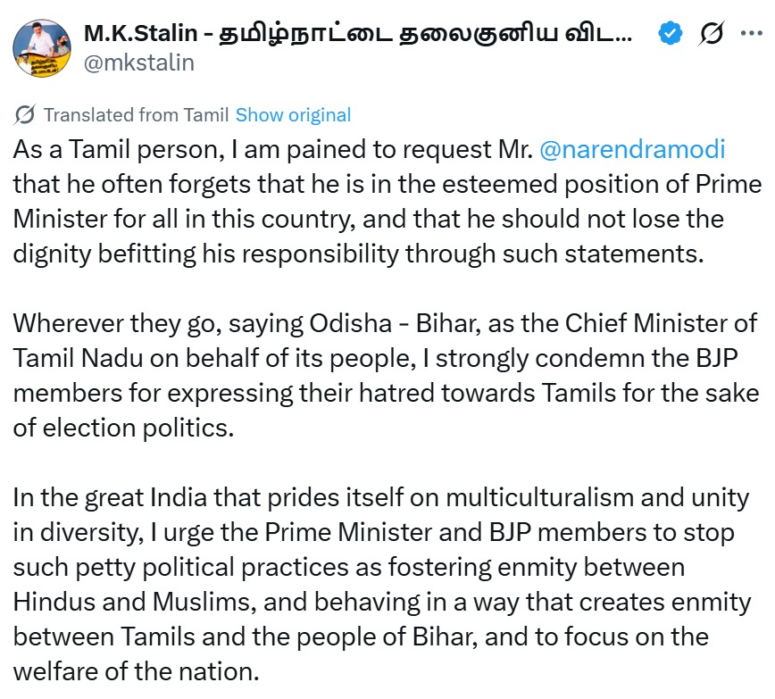 “I urge the Prime Minister and BJP members to stop such petty political practices … behaving in a way that creates enmity between Tamils and the people of Bihar, and to focus on the welfare of the nation.”