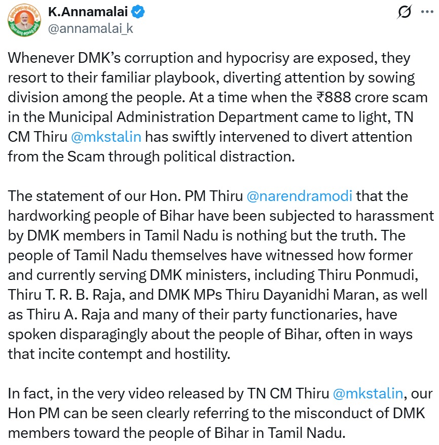 BJP Tamil Nadu president K. Annamalai hit back at Chief Minister M. K. Stalin, accusing him and the DMK of trying to divert public attention from the recent Rs 888-crore scam in the Municipal Administration Department. In a post on X, Annamalai said that whenever the DMK’s “corruption and hypocrisy” are exposed, it resorts to dividing people. He backed Prime Minister Modi’s remarks, saying DMK leaders, including Ponmudi, T. R. B. Raja, Dayanidhi Maran, and A. Raja, have repeatedly spoken disrespectfully about people from Bihar. He said Stalin’s claim that the PM insulted Tamils was false and an “insult to the office of the Chief Minister.” Annamalai urged Stalin to ‘end the politics of dividing, diverting, and distracting’.