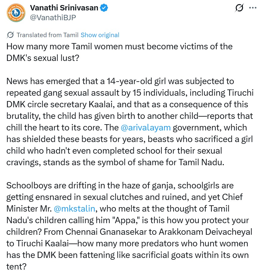 Srinivasan claimed that one of the accused named in media reports was a local DMK functionary. She said the incident symbolised what she described as an ‘administrative failure and moral collapse’ under the current government.