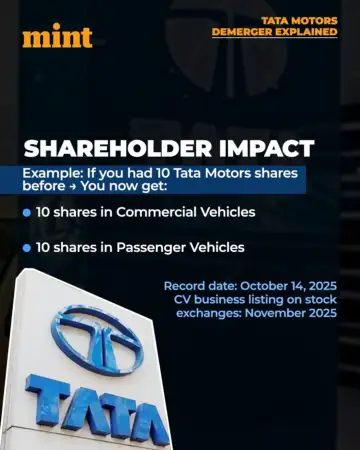 Investors holding Tata Motors shares as on October 14, the Tata Motors demerger record date, have received one equity share of Tata Motors Commercial Vehicles Ltd (TMLCV) for every one share held in Tata Motors Ltd, resulting in parallel holdings in both TMLCV and Tata Motors Passenger Vehicles Ltd (TMPV).