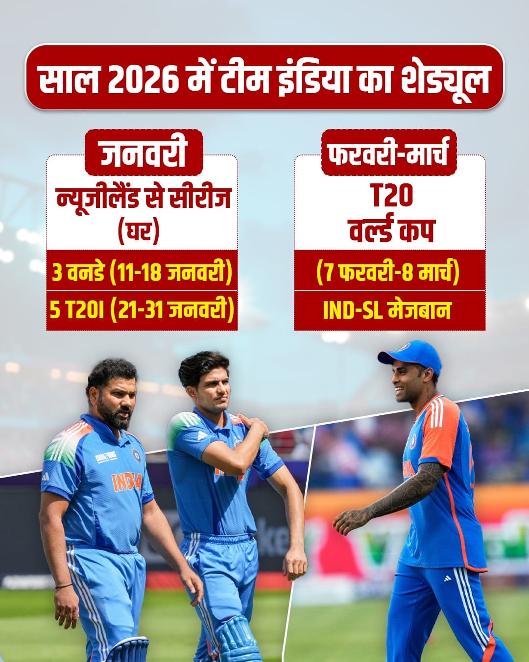 Indian Cricket Team Schedule 2026: टीम इंडिया ने साल 2025 में क्या कुछ हासिल किया? कहां कितने मैच खेले? वो तो हम सबने देखा. मगर नए साल यानी 2026 में उसका क्या कार्यक्रम है? उसके मैचों का शेड्यूल कैसा है? वो कहां और किस देश में कितने मैच खेलने वाली है? अब इन सवालों के बारे में जानना भी जरूरी है. टीम इंडिया के पास साल 2026 में भी ICC खिताब जीतने का मौका रहेगा. भारतीय क्रिकेट फैंस के पास ये जानने का मौका होगा कि 2027 में होने वाले वर्ल्ड कप से पहले उनके चहेते रोहित शर्मा और विराट कोहली किस तरह के फॉर्म हैं?