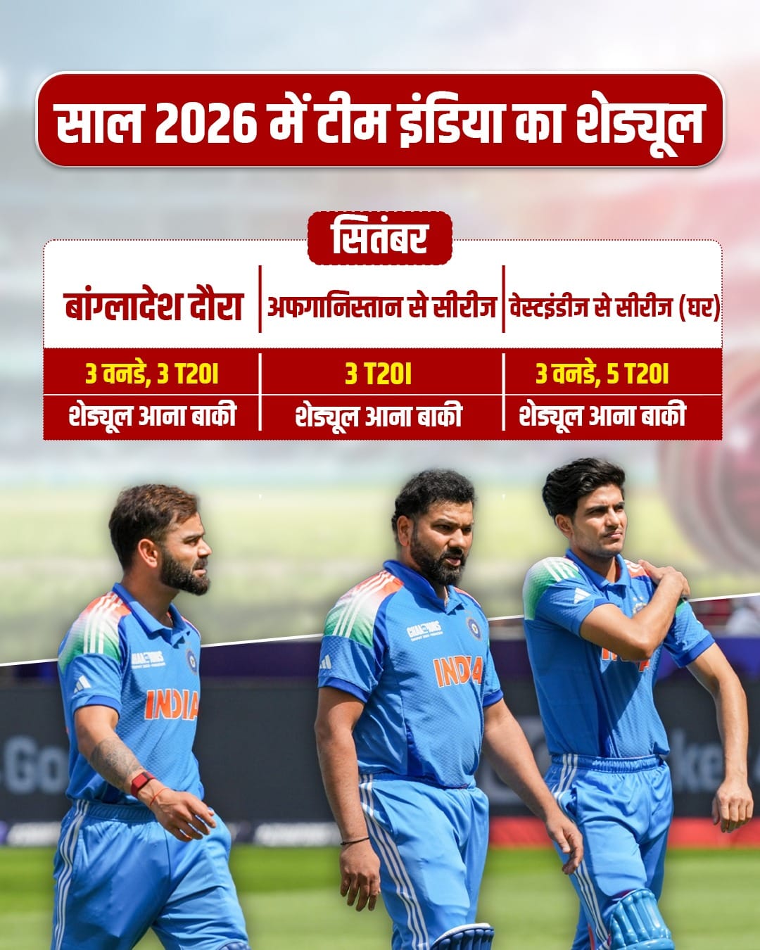 साल 2026 में सितंबर के महीने में भारतीय मेंस क्रिकेट टीम सबसे ज्यादा सीरीज खेलने वाली है. सितंबर 2026 में टीम इंडिया को पहले बांग्लादेश का दौरा करना है. फिर उसे अफगानिस्तान से सीरीज खेलनी है. उसके बाद वेस्टइंडीज से घरेलू सीरीज खेलनी है.