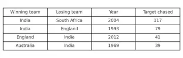 Before that, the bar was much lower. In 1993, India chased down 79 against England, a routine stroll by modern standards by but a vital win in a low-scoring contest. Two other successful chases at the venue have been even smaller. England knocked off 41 against India in 2012, and Australia hunted down just 39 back in 1969.