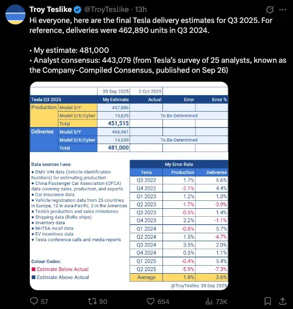 Tesla is now slated to report its third-quarter (Q3) deliveries on Thursday. Analysts on average expect the company to deliver approximately 441,500 vehicles, which is higher than the first two quarters of this year but lower than the 462,890 reported in Q3 2024, according to Reuters. However, Tesla delivery tracker Troy Teslike expects the company to deliver 481,000 deliveries for the three months through the end of September.