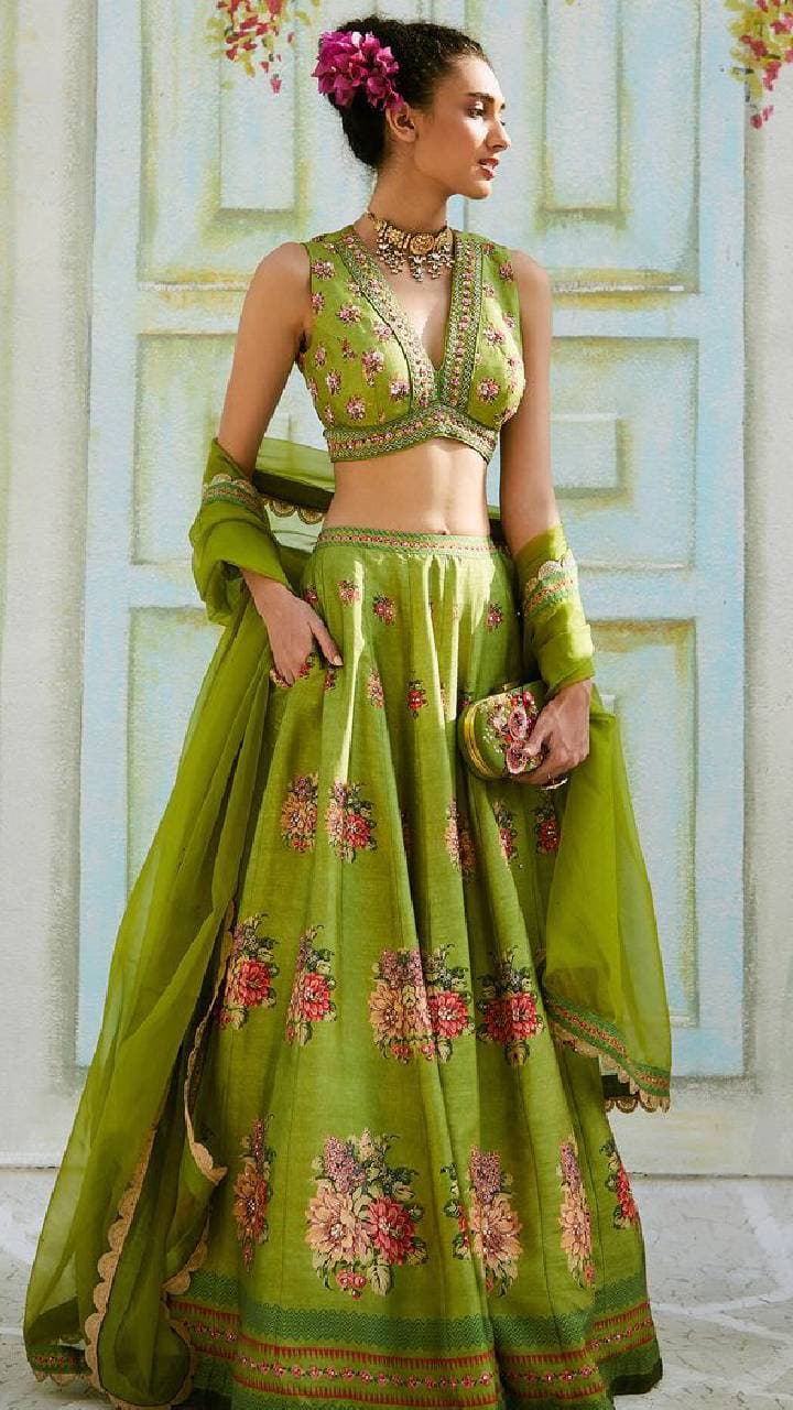 If you want a light, stylish and budget friendly option then choose boho print mehendi lehenga. There is a lot of moving around in Mehndi, in such a situation such a simple design is best.