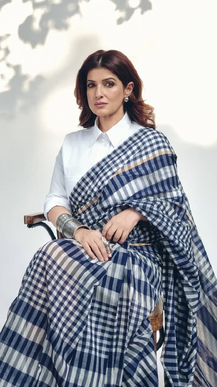White shirt blouse with checkered saree looks quite decent. Professor or teacher must choose this look of Twinkle Khanna.
