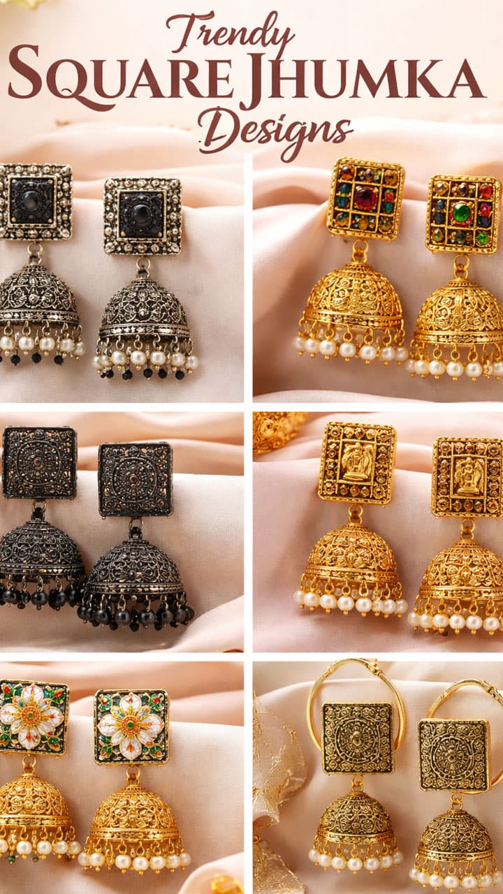 The fashion of round jhumki is old, now is the era of square, choose Square Jhumka Designs. Square Jhumka Designs Trendy Ethnic Earrings Oxidised Gold Temple Jhumka Ideas
