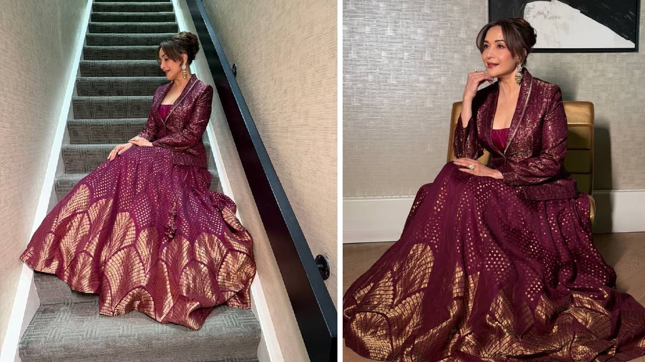 Madhuri Dixit is wearing a beautiful Indo Western purple lehenga. The specialty of the lehenga is its jacket style koti blouse. Instead of wearing a traditional blouse, Madhuri chose to wear a long jacket style koti with rich fabric, which is giving a modern touch to her look. The beautiful zari pattern and big leaves of the skirt look very beautiful in wine or maroon colored gold zari lehenga. For a royal elegant and unique Indo western look, you can easily buy this type of lehenga at a price of up to Rs 2000. You can wear such lehengas for weddings, receptions, festival parties and cocktail parties with an Indian touch.